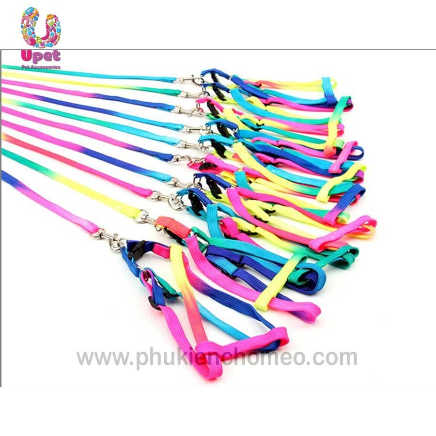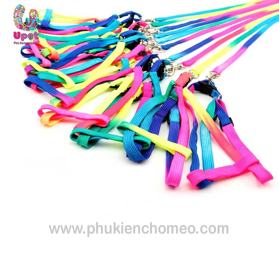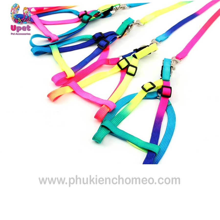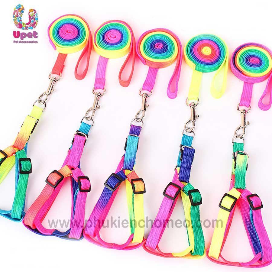Bộ dây dắt kèm đai yên ngựa làm từ chất liệu vải dù pha nilon với mầu sắc cầu vồng rực rỡ, thích hợp sử dụng cho mèo và các giống chó nhỏ
